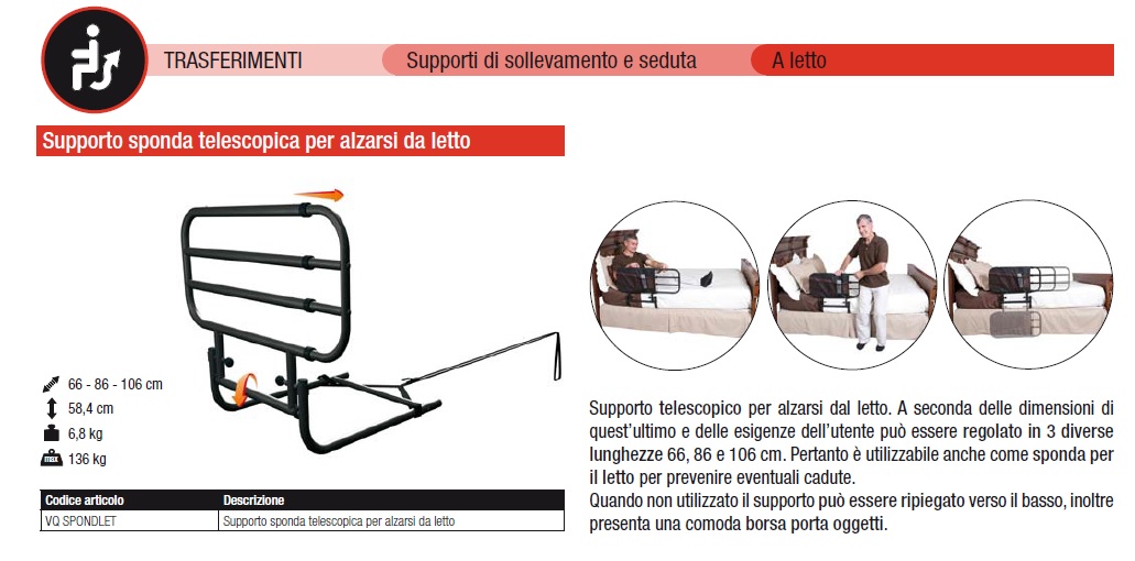 (Automatic translation) Telescopic support to get out of bed. Depending on the size of this last one and needs of User can be adjusted in 3 different lengths. E 'can also be used as a bed rail to prevent falls. When not in use it can support be folded down, has a bag port objects.