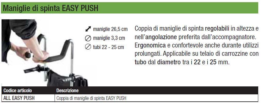 Pair of push handles adjustable in height and in the angle preferred by the chaperone. Ergonomic and comfortable even during prolonged use. Applicable on a frame of wheelchairs with a diameter between 22 and 25 mm.