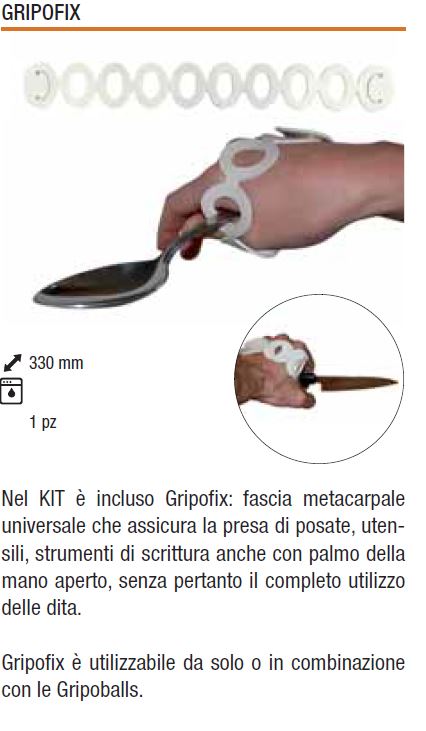 Universal metacarpal band that ensures the grip of cutlery, tools, writing instruments even with the palm of the open hand, without therefore the complete use of the fingers. Gripofix can be used alone or in combination with Gripoballs.