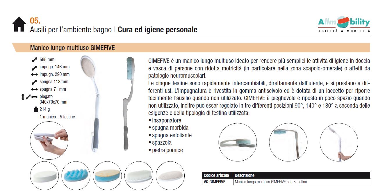 Long multi-purpose handle designed to simplify hygiene activities in the shower and bathtub for people with reduced mobility (especially in the shoulder-humeral area) or those affected by neuromuscular pathologies. equipped with five heads (soaper, soft sponge, exfoliating sponge, brush, pumice stone) interchangeable directly by the user and suitable for different uses. The handle is covered with non-slip rubber, it is foldable and adjustable in three different positions: 90 °, 140 °, 180 °.