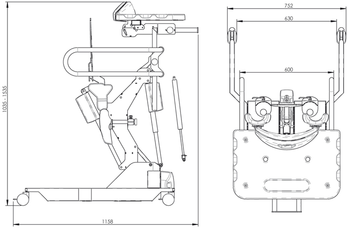 Il dispositivo consente di assumere e mantenere la postura eretta e di essere trasferito in ambienti interni con l'assistenza di un operatore. Con sellino allungato e fisso per facilitare l'accessibilità. Verticalizzazione elettrica mediante motore alimentato da batterie ricaricabili e con un comando a pulsantiera. L'adattamento dell'intera struttura centrale all'altezza del soggetto è attuata elettricamente con unità motore. Maniglioni di supporto e tavolo di servizio.