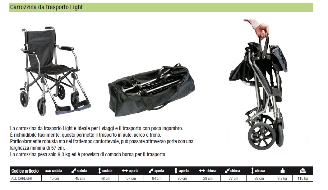 Carrozzina per il viaggio. Presenta una seduta imbottita, pedana poggiapiedi regolabile secondo le esigenze dell'utente e braccioli dall'inclinazione variabile. Dotata di freni di stazionamento e richiudibile può essere riposta in una comoda borsa tracolla, in valigia o nel bagagliaio di un'auto.