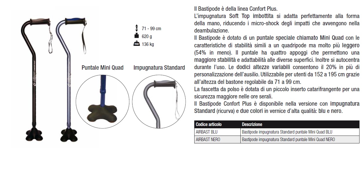 Bastipode dotato di un puntale speciale chiamato Mini Quad. L’impugnatura Soft Top imbottita si adatta alla forma della mano, riducendo i micro-shock degli impatti che avvengono nella deambulazione. Il puntale ha quattro appoggi che permettono una maggiore stabilità e adattabilità alle diverse superfici. Inoltre si autocentra durante l’uso.