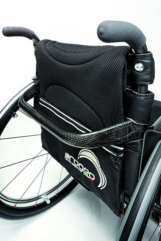 Carrozzina monoscocca, in fibra di carbonio realizzata su misura. Schienale in fibra di carbonio regolabile in altezza ed inclinazione, con imbottitura leggera.Adatta sia per uso interno che esterno.